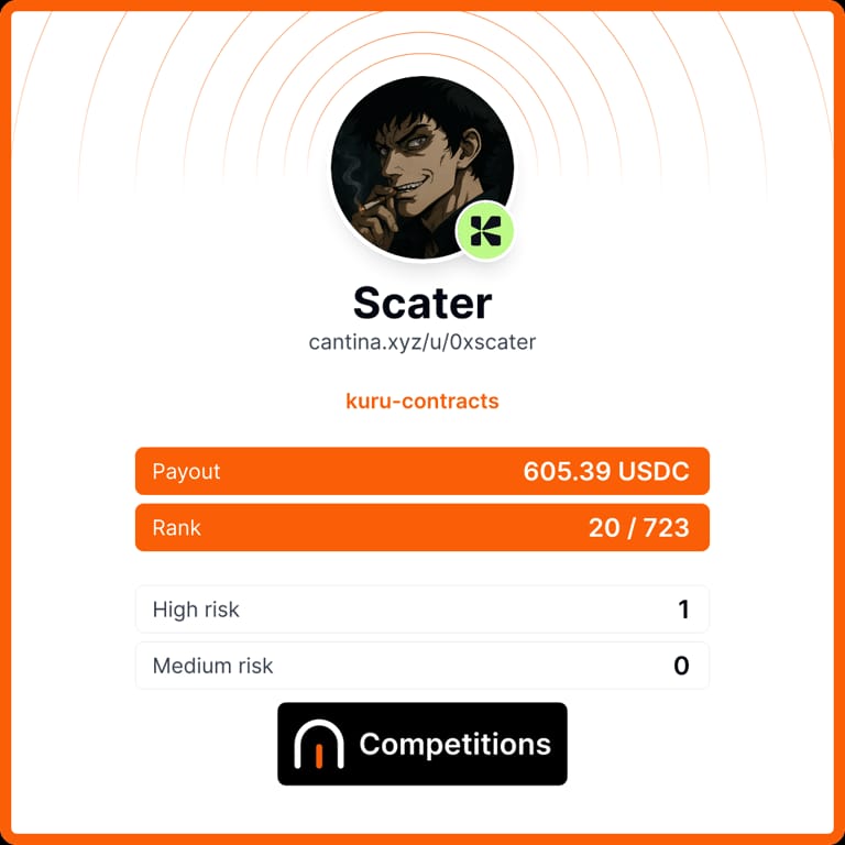 | Cantina | Kuru Protocol | Top 20 | 1 High | $605.39 | click here | View Report |